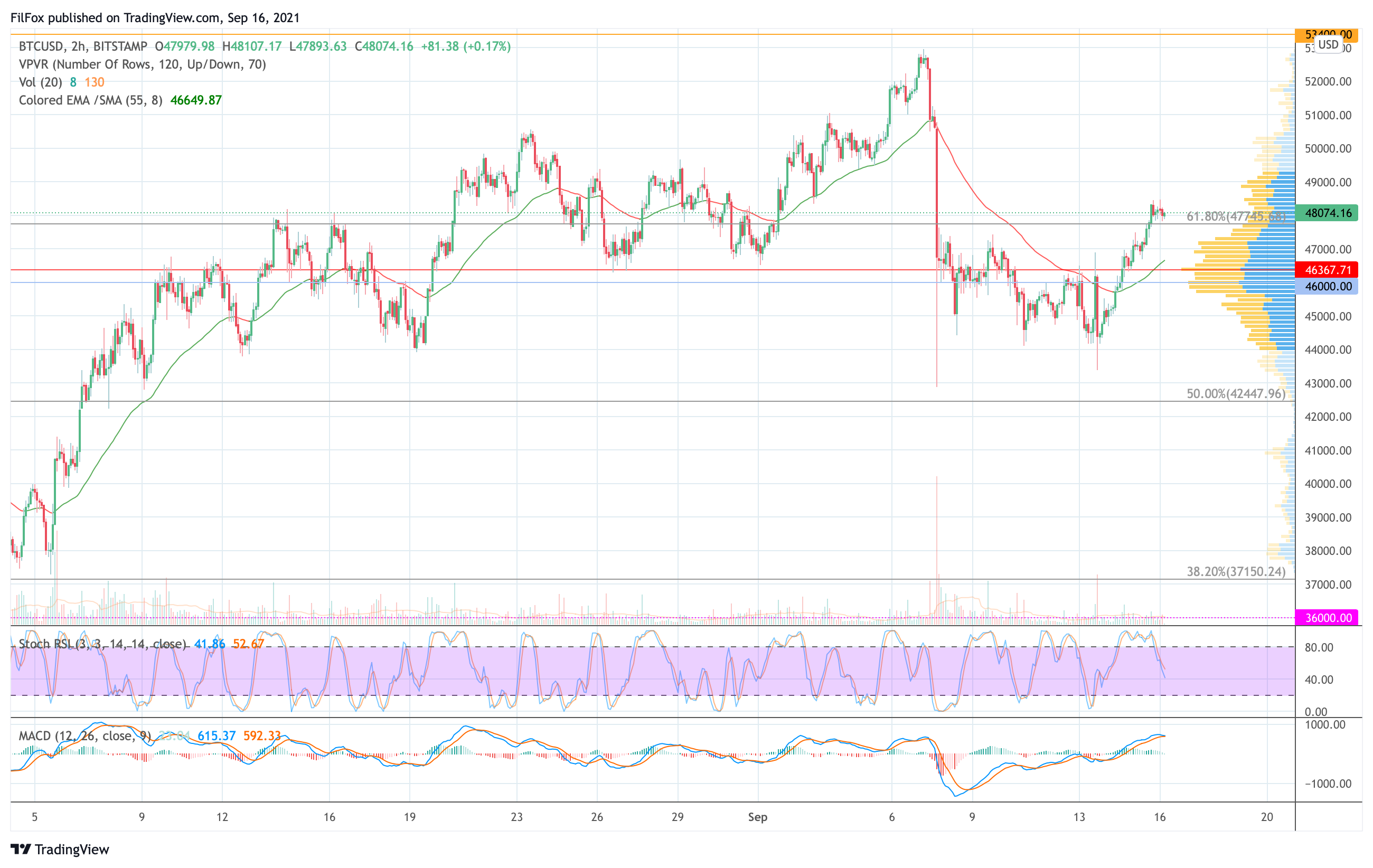 Вчера в первой половине дня цена биткоина консолидировалась в районе отметки 47000.00 USD, а после обеда быки пробили уровень 61.8% фибо (47745.68 USD) и обозначили недельный максимум в точке 48455.00 USD.