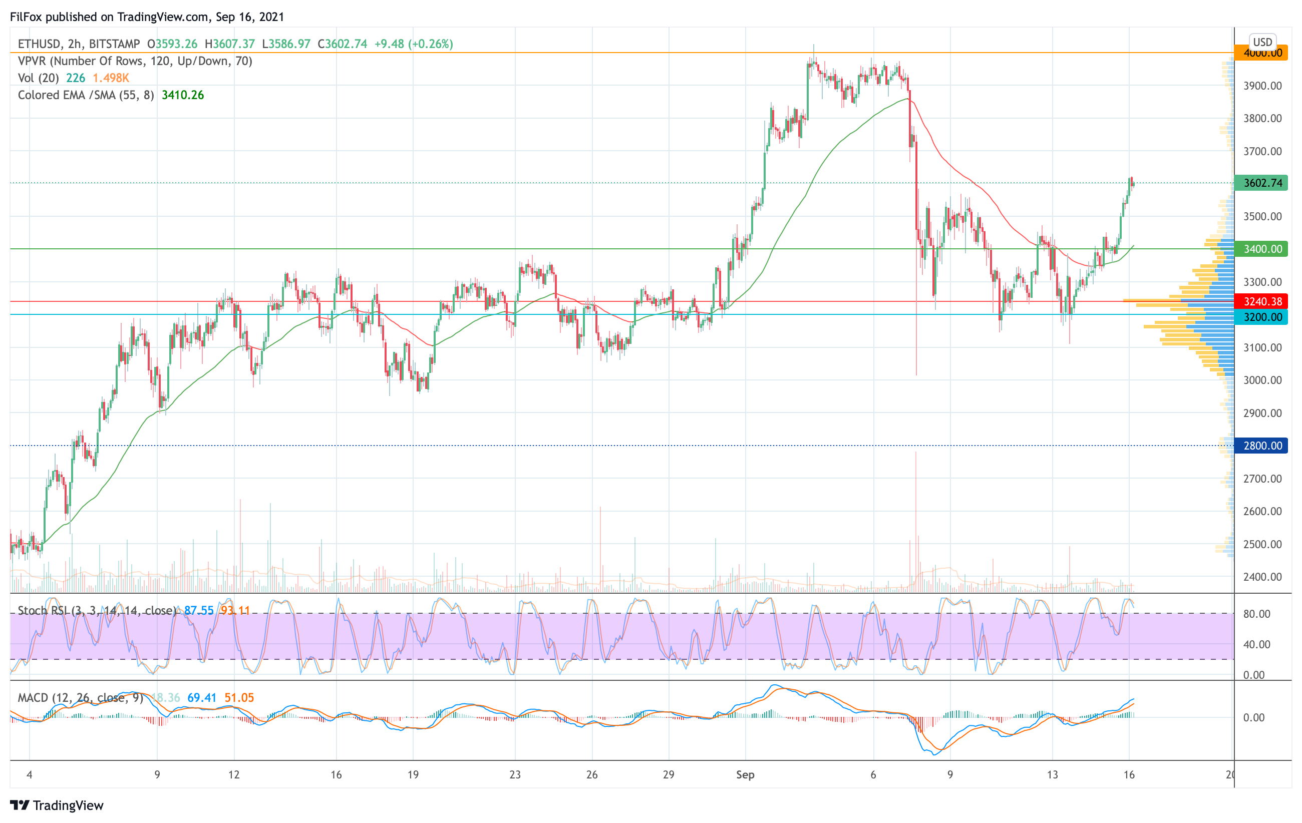 Вчера цена Ethereum нащупала поддержку на уровне 3400.00 USD и до конца дня выросла в область 3600.00 USD, а ночью установила недельный максимум в районе отметки 3620.00 USD.