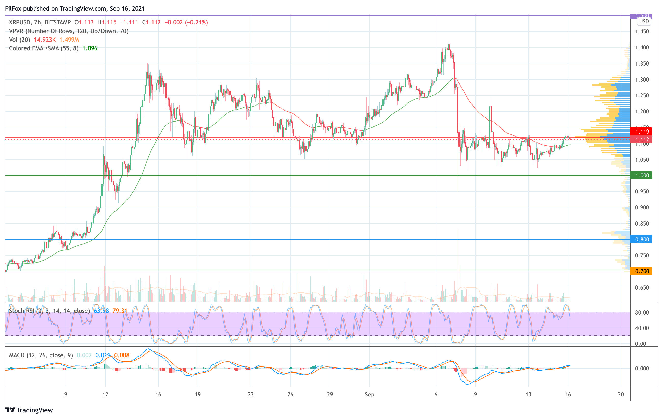 Ночью пара XRP/USD просела и на утро возвращается в область средних цен. Если сегодня двухчасовая EMA55 ограничит откат, то умеренный рост продолжится в область 1.150 USD. Если покупатели нарастят объёмы, то пара может достигнуть максимум на отметке 1.200 USD.