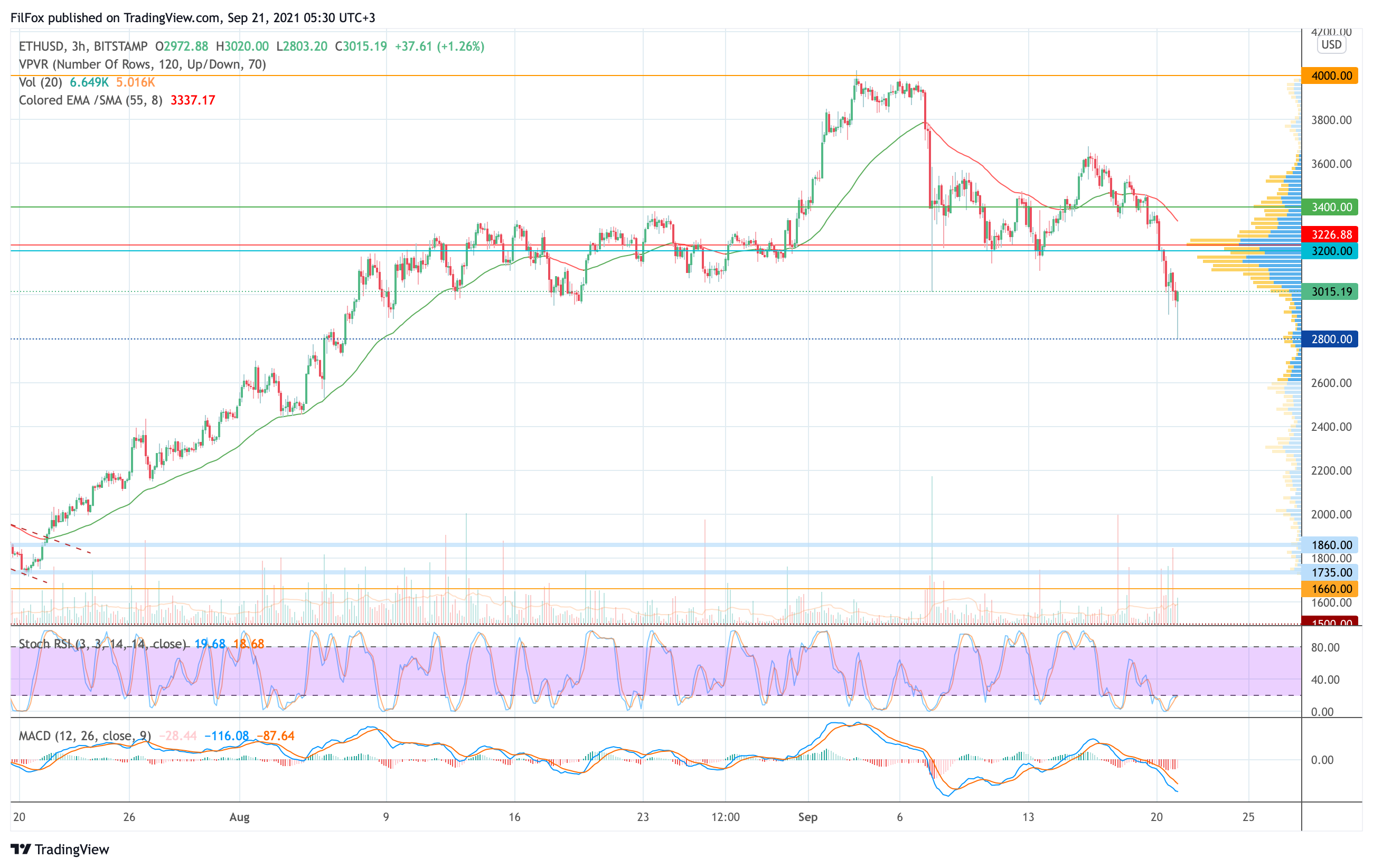 Вчера медвежий натиск пробил психологический уровень три тысячи долларов и сегодня ночью цена Ethereum протестировала поддержку 2800.00 USD.