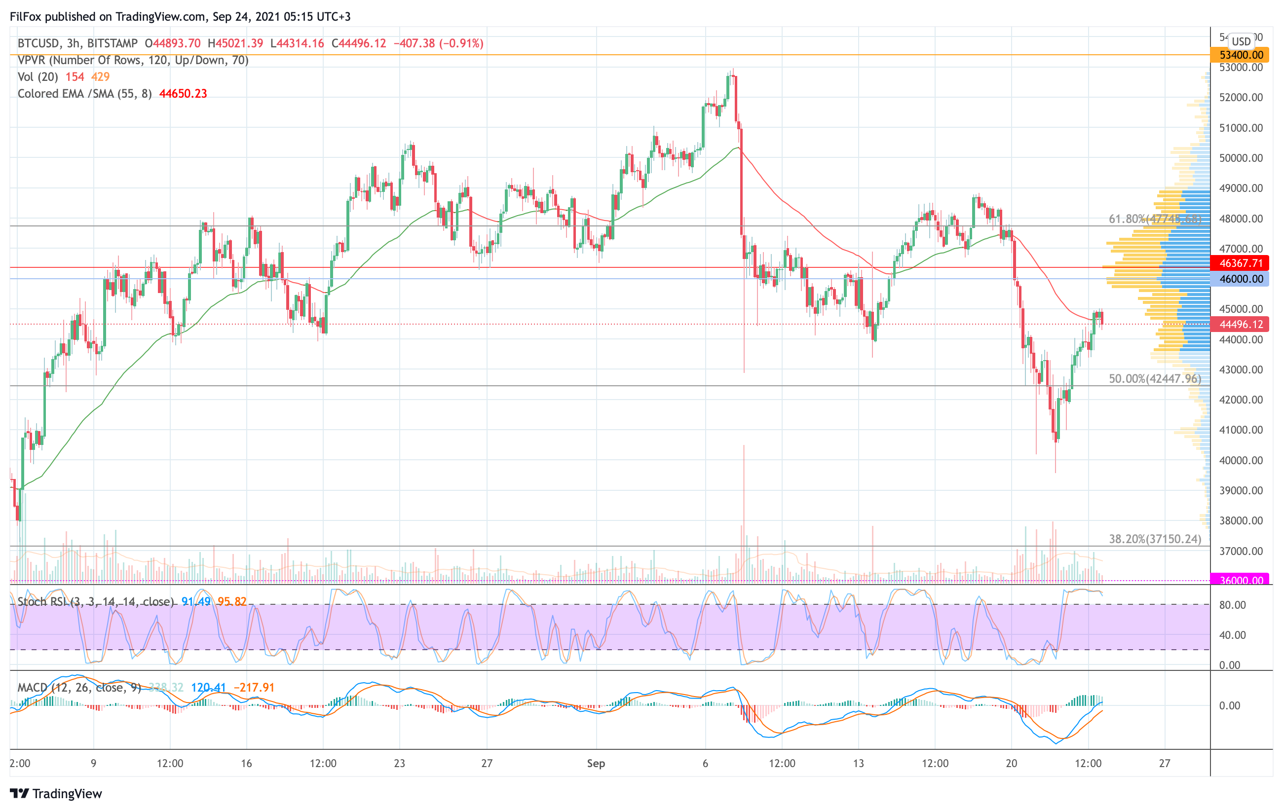Вчера в течение дня покупателям удалось удержать инициативу, и цена BTC восстановилась к 45000.00 USD. В этой области проходит трёхчасовая скользящая средняя EMA55, которая может поддержать пару в случае усиления медвежьего натиска.