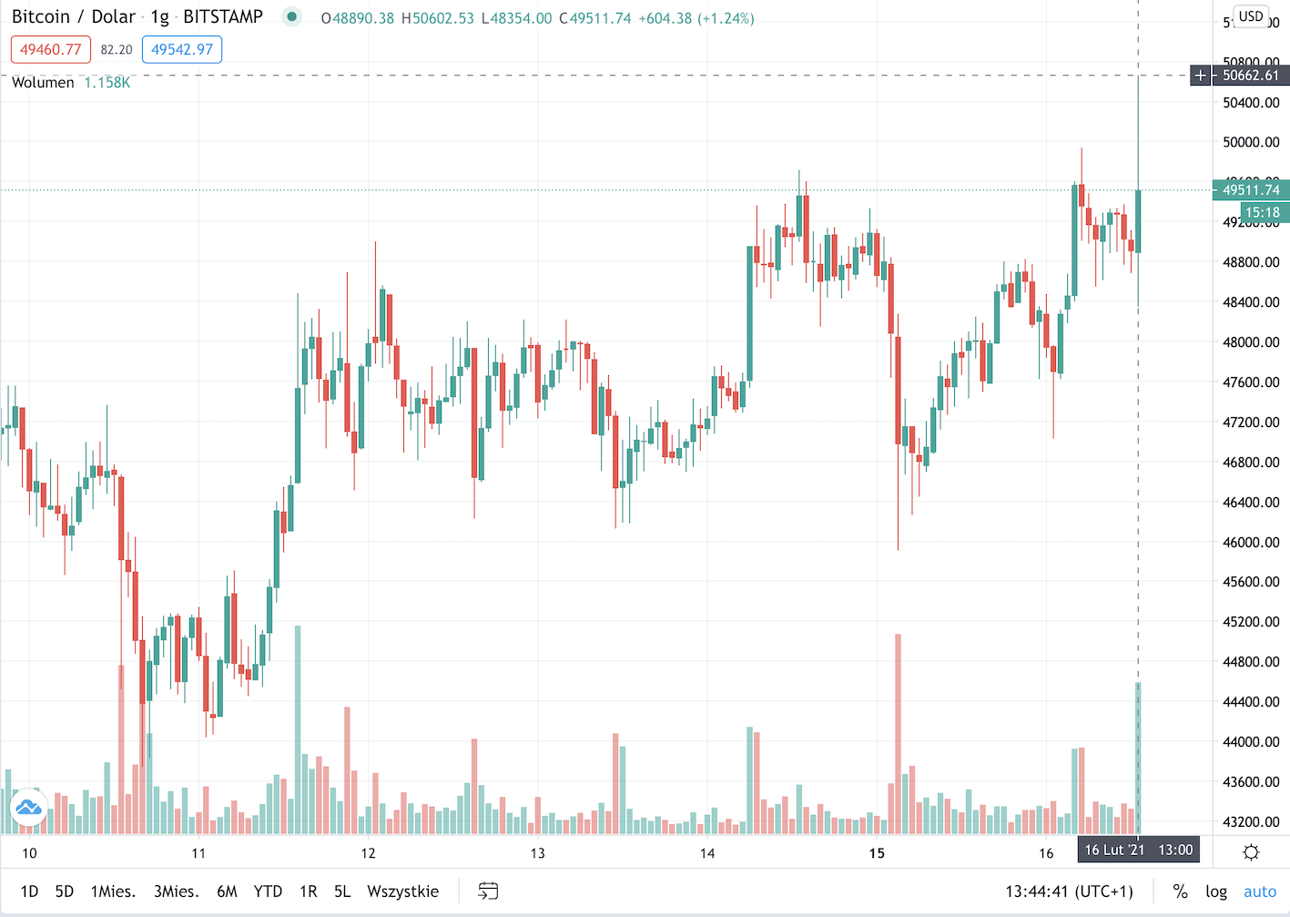 16 февраля цена биткоина установила новый исторический рекорд выше $50,000. На момент написания статьи максимум был установлен около $50,600.