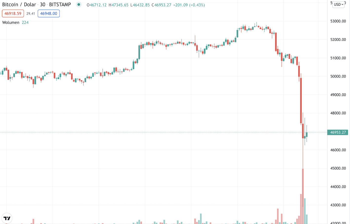 За день цена биткоина потеряла $8,000, к моменту написания восстановившись до $47,000.